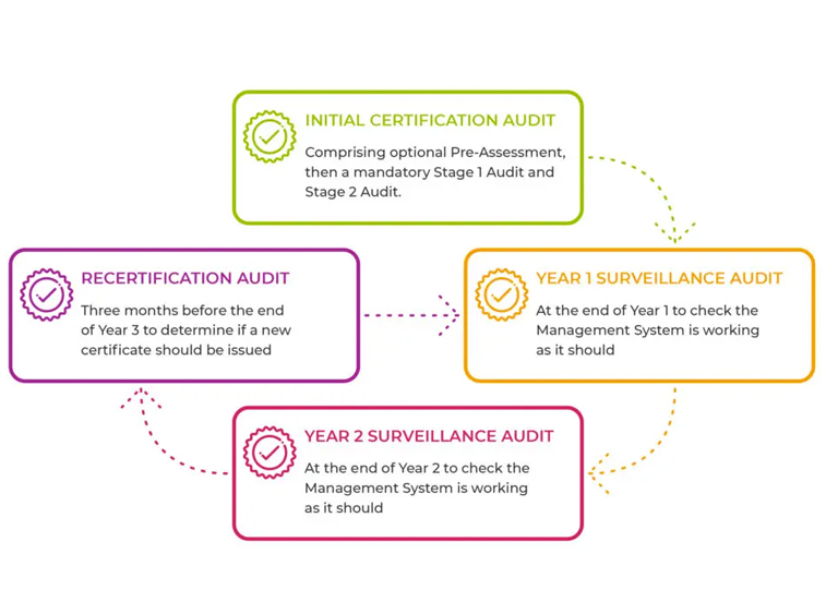 Dalam kebanyakan situasi, organisasi Anda akan menjalani Audit Pengawasan Tahunan pada akhir Tahun 1 dan Tahun 2. Yang pertama sebenarnya akan dilakukan sedikit sebelum akhir tahun pertama dengan ISOQAR. Ini agar siklus tiga tahun diatur untuk memungkinkan Audit Sertifikasi Ulang Anda dilakukan sebelum akhir Tahun 3. Ini penting karena jika ada ketidaksesuaian yang ditemukan pada akhir tahun ketiga, mungkin ada jeda dalam sertifikasi Anda. saat Anda mengambil tindakan korektif.